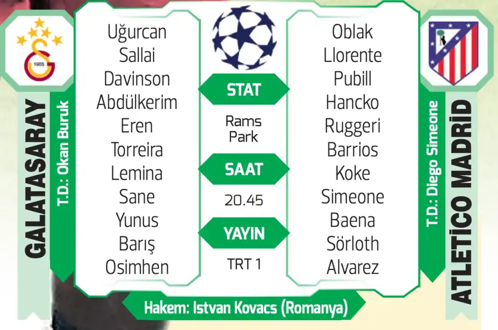 Galatasaray, UEFA Şampiyonlar Ligi’nde sezonun kaderini belirleyecek olan 7. hafta mücadelesinde İspanyol devi Atletico Madrid‘i İstanbul’da ağırlıyor. RAMS Park’ta yine dillere destan bir atmosferin oluşması beklenirken, sarı-kırmızılı taraftarlar takımlarından Avrupa’da yeni bir zafer daha bekliyor. “Aslan”ın kükreyeceği gecede, tüm Türkiye bu kritik randevuya kilitlenmiş durumda.