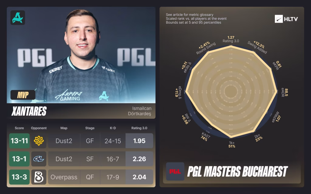 Aurora’nın Türk çekirdeği, playoff’larda rakipsizdi. XANTARES 1.38 rating ve 4 Player of the Map’le MVP’yi kaptı; Wicadia 1.31 map win rating’le EVP birincisi. MAJ3R’ın IGL’liği, All-Star’da yerini aldı. Türk oyuncular, turnuvanın yıldızları olarak HLTV’nin listesinde domine etti.