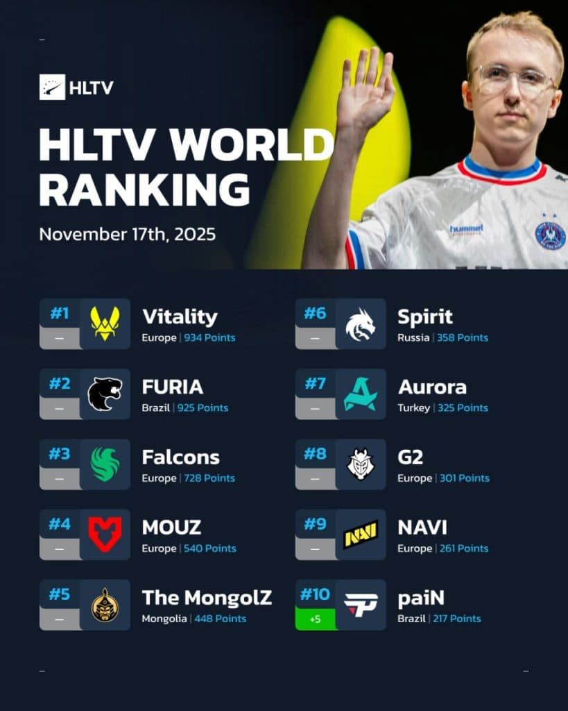 Vitality’nin 934 puanla tahtındaki saltanatı (ZywOo’nun liderliğinde), FURIA’nın 925 puanıyla 2’nciliği Brezilya CS2’sinin gücünü pekiştiriyor. Moğol The MongolZ ise 448 puanla 5’nci sırada – Asya takımlarının global etkisi artıyor.